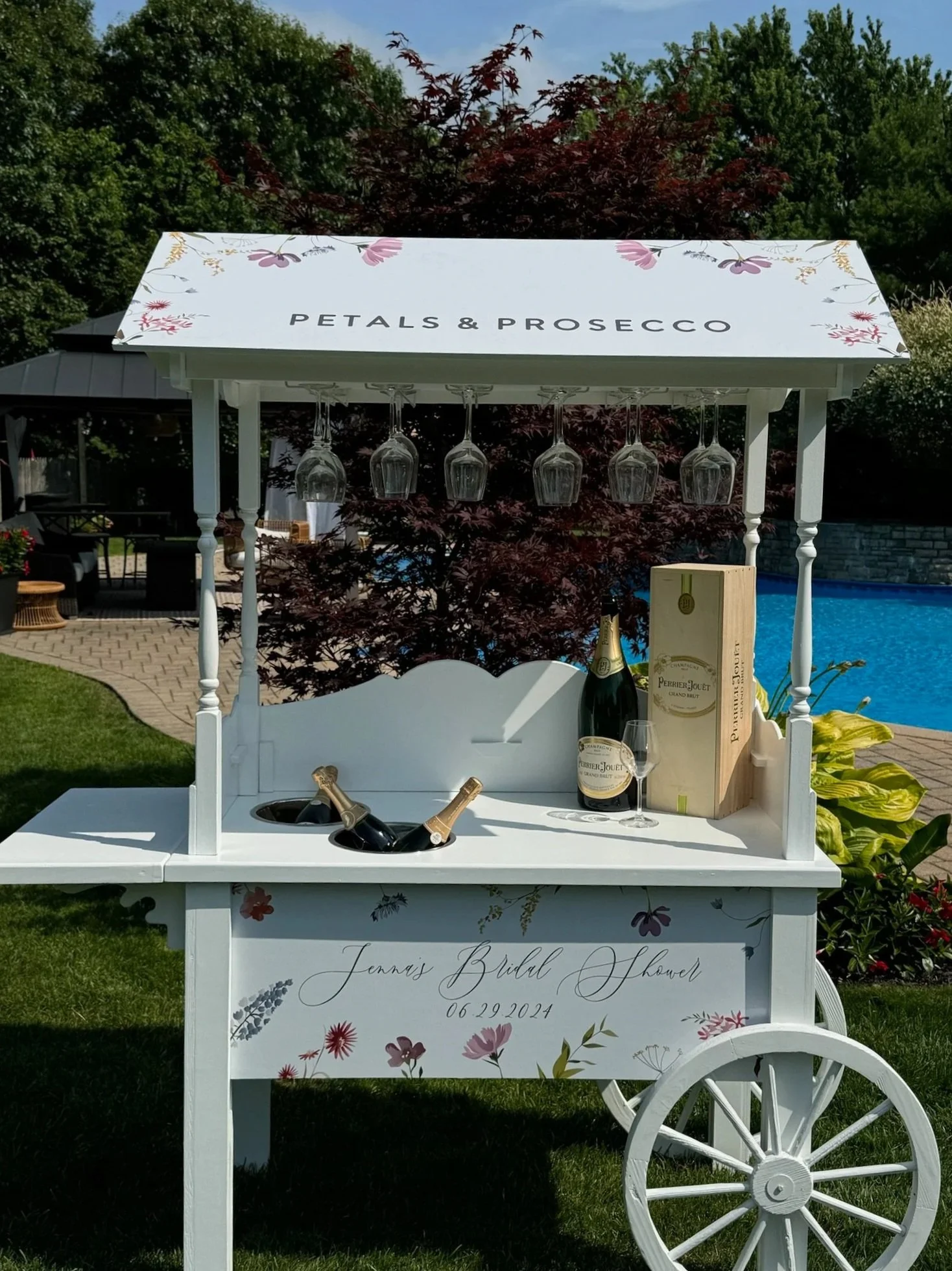 A beverage-forward installation featuring built-in ice compartments and integrated overhead glassware storage, ideal for celebratory or hospitality-driven events. *Alcohol not provided.
